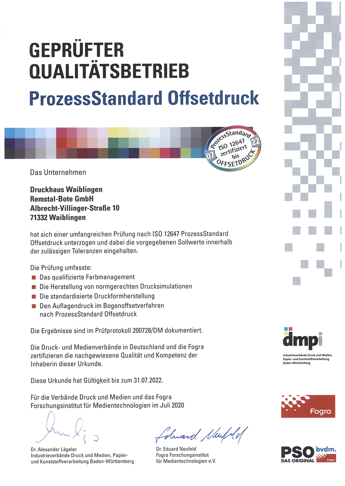 Nachweislich zuverlässige Qualität: Die Prüfung dieser Zertifizierung umfasst unter anderem unser qualifiziertes Farbmanagement sowie den Auflagendruck im Bogenoffsetverfahren.